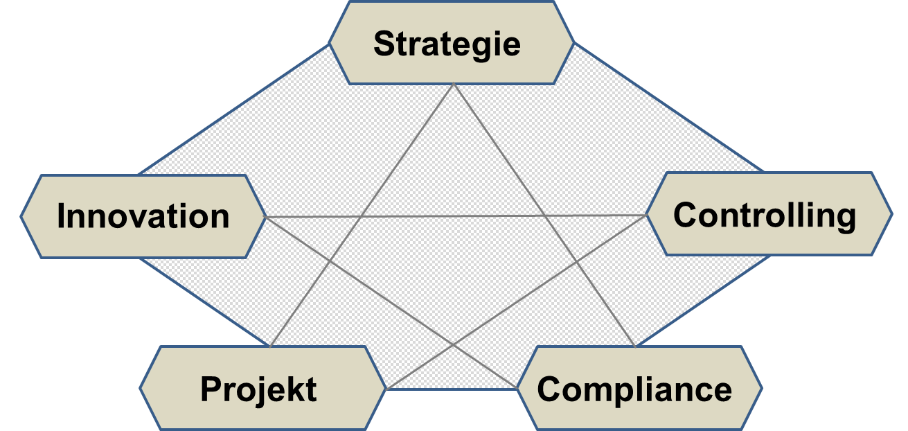 Im globalen Wettbewerb wird die Vernetzung immer wichtiger: unternehmensextern mit Kunden, Partnern, Lieferanten sowie intern zwischen Bereichen, Abteilungen, Management und Mitarbeitern. Deshalb ist uns wichtig, das Unternehmen einschließlich seiner Umwelt als Gesamtsystem zu betrachten. Eine zukunftsorientierte Strategie ist die Basis jeden Unternehmens. Strategischer Erfolg stellt sich nur ein, wenn genügend Innovationen am Markt platziert und durch effizientes Projektmanagement umgesetzt werden. Ein gutes Controlling trägt dabei zum nachhaltigen wirtschaftlichen Erfolg bei. Hohe Compliance in der gesamten Organisation stellt sicher, dass sich das Management und alle Mitarbeiter fair und regelkonform verhalten und damit zum Image und letztendlich zum wirtschaftlichen Erfolg beitragen.